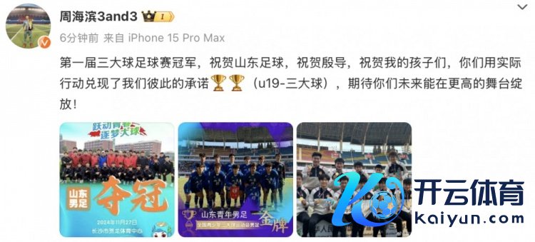 11月27日讯 在山东队夺得首届三大球指导会足球神色冠军后,泰山U17梯队主帅周海滨更新社媒奉上了祈福。