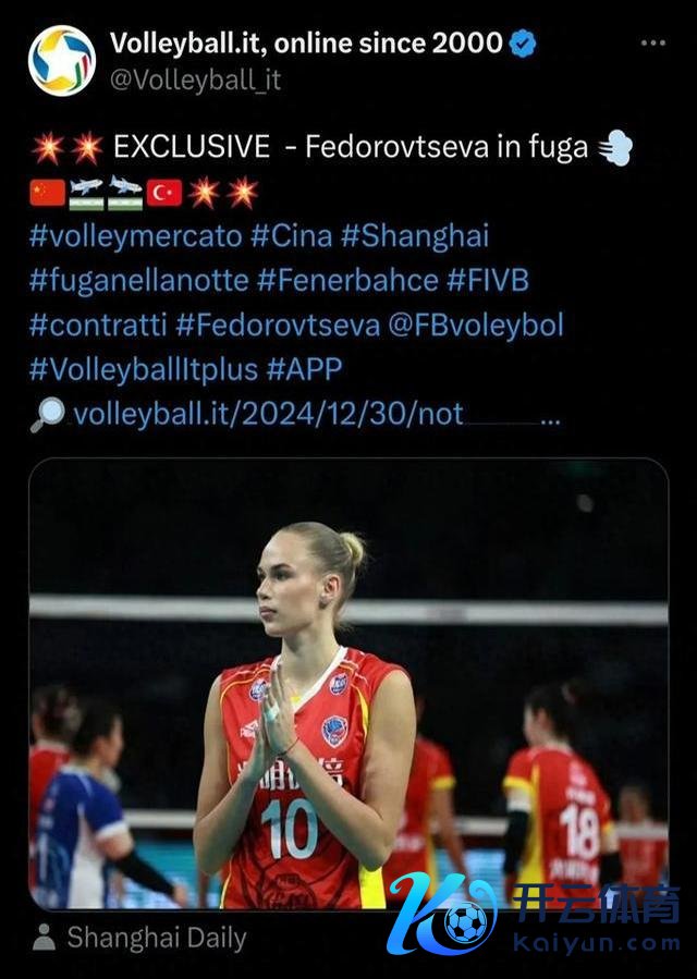 意大利媒体volleyball.it奏凯扔了个炸弹:小采娃,等于阿谁俄罗斯“小钢炮”费多罗夫采娃,尽然背着上海女排,暗暗摸摸地撕了协议,一行烟跑回老东家费内巴切了!