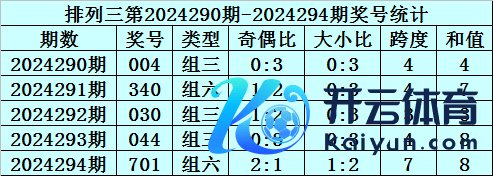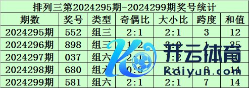 上期回来:枚举三第2024299期开奖号码为581。奖号类型为组六,奇偶比为2:1,大小比为2:1,跨度为7,和值为14。