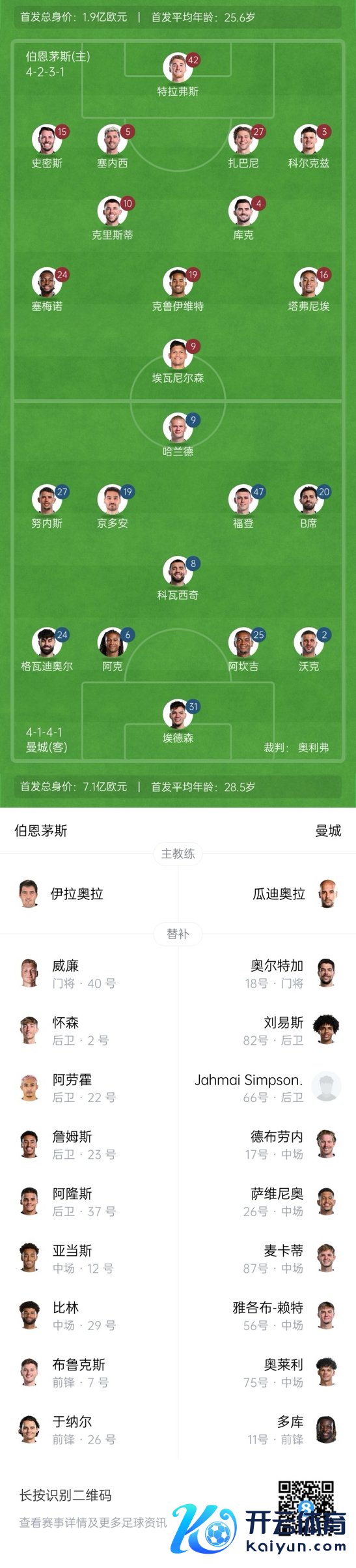 曼城首发:31-埃德森、2-沃克、25-阿坎吉、6-阿克、24-格瓦迪奥尔、8-科瓦西奇、19-京多安、20-B席、47-福登、27-努内斯、9-哈兰德