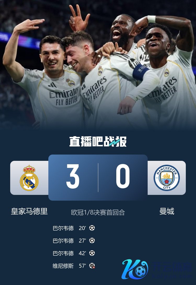 03月12日讯 欧冠1/8决赛首回合,皇马3-0完胜曼城。