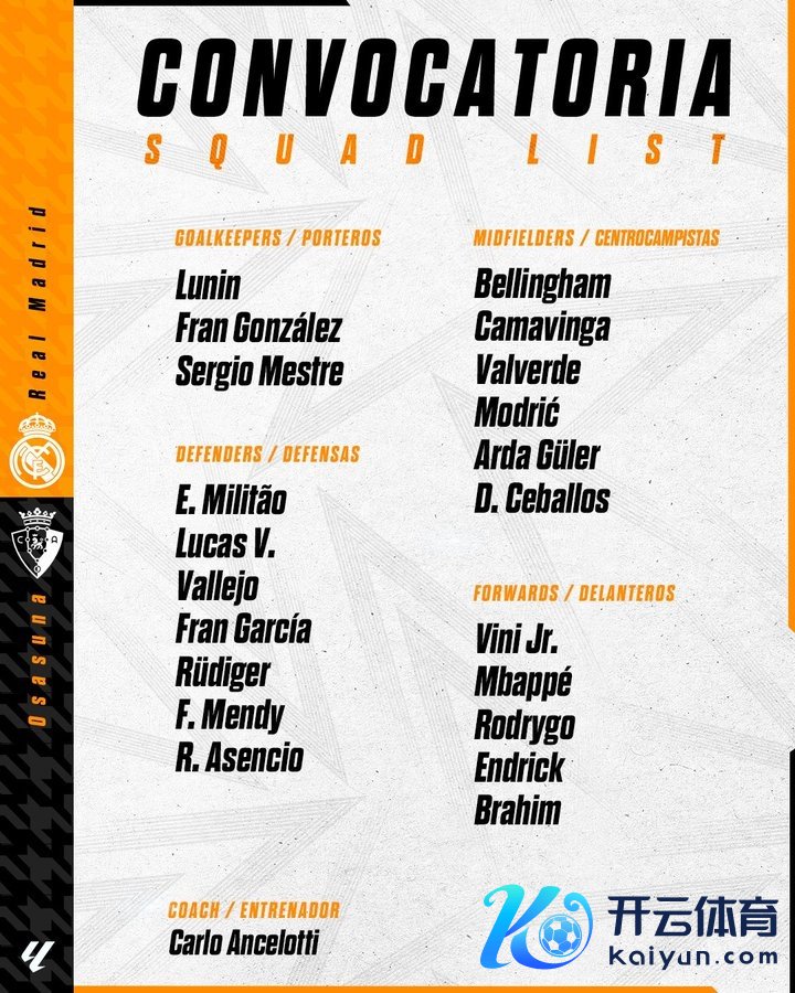 11月8日讯 11月9日21点,本轮西甲,皇马将在主场对阵奥萨苏纳。皇马公布本场比赛名单,姆巴佩、贝林厄姆、维尼修斯等东说念主均参加比赛名单。