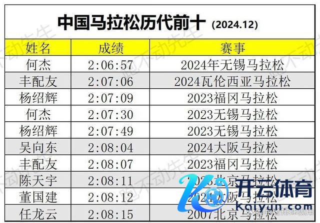 不外丰配友相配的年青,2001年出身的他目下只须23岁,而马拉松这项剖判在30岁左右才是巅峰,若是伤病相比少的情况下,业绩糊口还会更长,是以中国马拉松的新记载应该在2025年会再次产生,而一年前丰配友和杨绍辉去日本参预福冈马拉松,当时候他的成绩是2小时8分7秒,一年的技能他的成绩提升了1分1秒。跟着丰配友的逾越,中国马拉松前十名发生更新,之前把中国马拉松的记载保合手了16年的任龙云只可排到第十名。