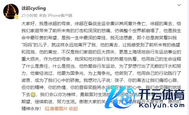 12月10日,徐超的母亲登陆了他的外交账号@徐超cycling,清晰徐超是在备战全运会集训本事不测身一火的,并称徐超的离世不仅是家庭的无边损失,亦然上海局面自行车通顺自在的要紧损失,“给咱们家庭带来了前所未有的打击和深深的悲伤,仿佛系数全国齐坍塌了”。