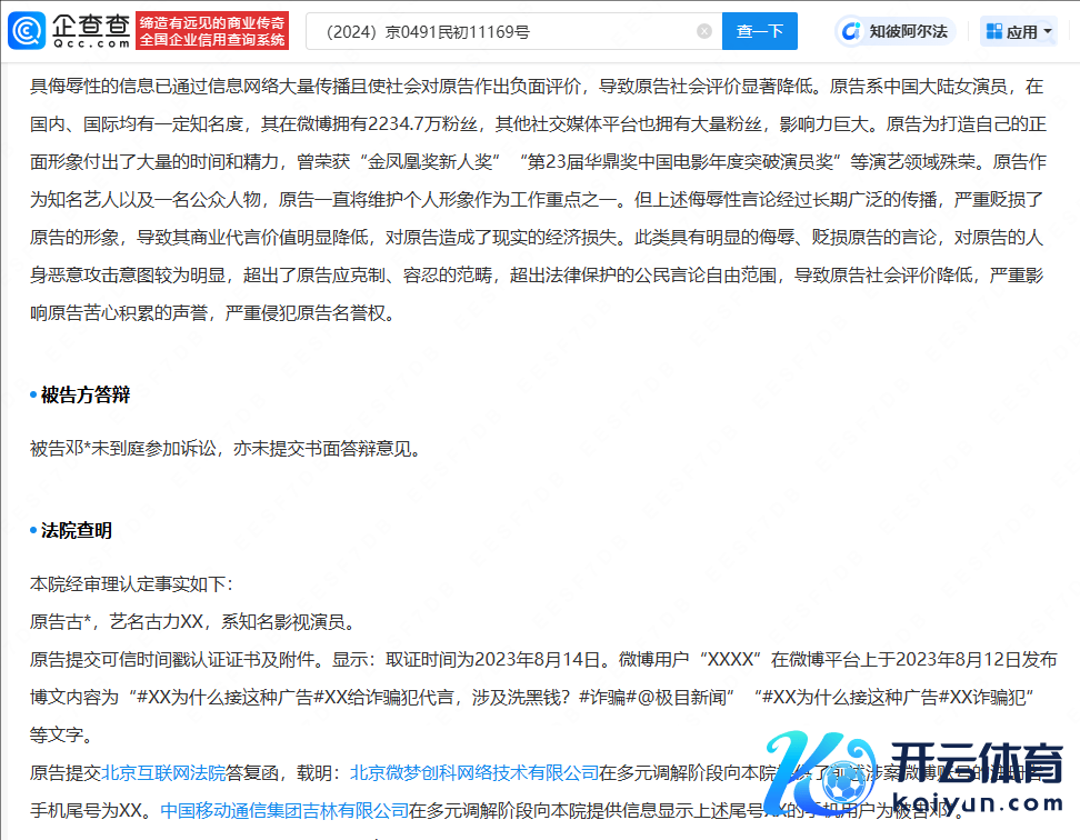 企查查APP显露,法院刊登古力娜扎诉邓某相聚侵权拖累纠纷一案判决书。晓谕显露,古力娜扎方告状被告通过涉案账号发布现实并使用“应用犯、洗黑钱”等词汇,严重毁伤了古力娜扎的名誉,并提交真确时辰戳认证文凭及附件。