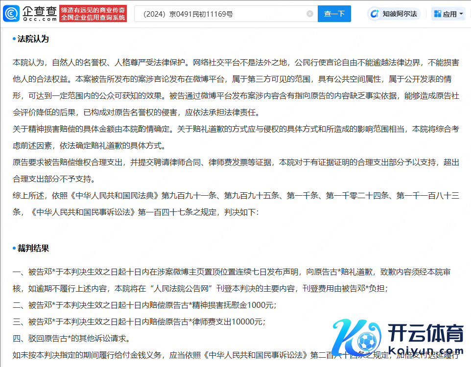法院觉得,被告密布案涉现实枯竭事实依据,已组成对原告名誉权的侵害,判处被告邓某在主页置顶位置聚首七日发布声明,向古力娜扎赔礼说念歉,并抵偿精神毁伤安危金、讼师费支拨11000元。